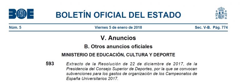 Ayer se publicó en el Boletín Oficial del Estado la Resolución del Presidente del Consejo Superior de Deportes por las que se convocan subvenciones para sufragar los gastos de organización de los Campeonatos de España Universitarios 2018. Podrán acceder a…