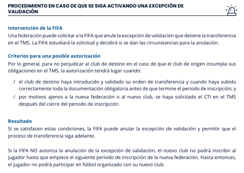 De esta forma, y tal como reza el comunicado del equipo español, la RFEF solicitó a FIFA la anulación de la excepción el 2 de septiembre, es decir, que dejase continuar la tramitación pese a que el TMS había bloqueado el expediente por un motivo de validación (por ejemplo, petición de CTI fuera de plazo o documentos remitidos tarde). La Guía internacional de FIFA sobre transferencias explica que esa anulación es posible, pero se concede solo en circunstancias excepcionales y a criterio de FIFA; normalmente se valora si el club destino subió y validó su parte antes del cierre y si la demora fue debida a razones ajenas a él.