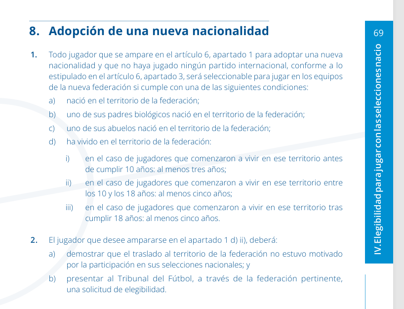 Desde el punto de vista normativo, la FIFA regula estas situaciones en su Reglamento de aplicación de los Estatutos, concretamente en los artículos 6 a 10. En ellos se establecen las condiciones bajo las cuales un jugador puede cambiar de asociación o representar a un país distinto al de su nacimiento. Los requisitos principales incluyen poseer la nacionalidad del nuevo país y cumplir ciertos vínculos objetivos: haber nacido allí, tener padres o abuelos del país, o haber residido al menos cinco años de forma continua después de cumplir los 18 años. Estas disposiciones buscan evitar los llamados “fichajes por nacionalidad”, donde las selecciones buscan talento más que identidad.